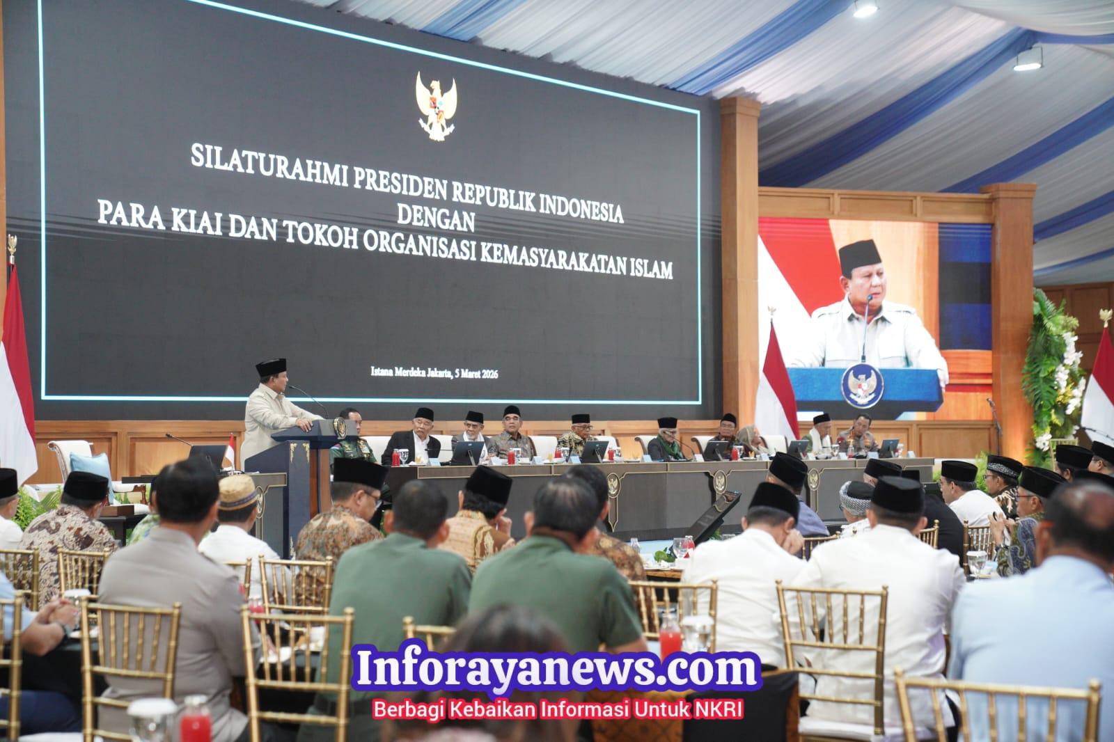 InfoRayaNEws.com, Jakarta — Presiden Republik Indonesia, Prabowo Subianto, menggelar silaturahmi dengan para kiai, pimpinan pondok pesantren, dan tokoh agama Islam di Istana Merdeka, Jakarta, Kamis (5/3). Acara silaturahmi tersebut diawali dengan berbuka puasa bersama.