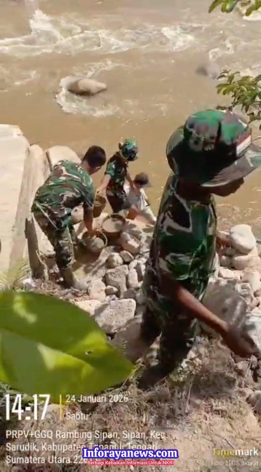 Berdasarkan pantauan di lokasi, Sabtu (24/1), sejumlah personel TNI tampak bahu-membahu memulai proses pembangunan jembatan tersebut. Sebagian mengaduk semen, lalu membawanya menggunakan gerobak dorong ke tepi sungai.
