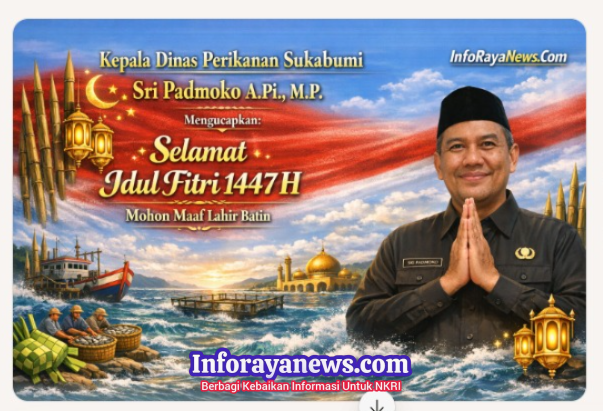 InfoRayaNews.Com – Sukabumi, 21 Maret 2026 — Dalam suasana penuh syukur dan kemenangan, Kepala Dinas Perikanan Kabupaten Sukabumi, Sri Padmoko A.Pi., M.P., menyampaikan ucapan selamat Hari Raya Idul Fitri 1447 Hijriah kepada masyarakat Sukabumi, khususnya para pelaku usaha kelautan dan perikanan.