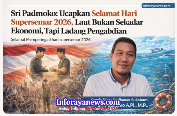 Inforayanews.com, Sukabumi, 11 Maret 2026 — Memperingati Hari Supersemar, Kepala Dinas Perikanan Kabupaten Sukabumi, Sri Padmoko A.Pi., M.P., menyampaikan ucapan selamat kepada masyarakat Sukabumi, khususnya pelaku usaha kelautan dan perikanan yang terus menjaga semangat pengabdian dan keberkahan laut.