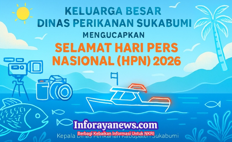 InfoRayaNews.Com, Sukabumi, – Dinas Perikanan Kabupaten Sukabumi dengan penuh rasa hormat dan kebanggaan menyampaikan selamat memperingati Hari Pers Nasional (HPN) 2026. Semoga insan pers senantiasa menjadi garda terdepan dalam menyuarakan kebenaran, memperkuat demokrasi, serta menghadirkan informasi yang mencerahkan masyarakat.