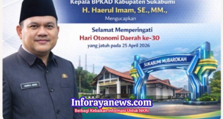 Kepala BPKAD Sukabumi Kepala BPKAD Sukabumi, H. Haerul Imam, SE., MM., Ucapkan Selamat Hari Otonomi Daerah 2026: Optimis Wujudkan Sukabumi Mandiri dan Berkah Berita, Kartu Ucapan|April 6, 2026April 9, 2026by aaruslan007@gmail.com InfoRayaNews.com – Sukabumi – Kepala Badan Pengelolaan Keuangan dan Aset Daerah (BPKAD)
