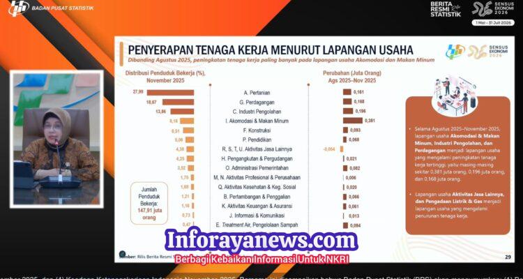 Angka Pengangguran 1,37 Juta Lapangan Kerja Tercipta, Angka Pengangguran RI Turun Jadi 4,71 Persen di November 2025 Berita, Info Presiden, Pemerintahan|February 6, 2026by aaruslan007@gmail.com InforayaNews.Com,- Jakarta – Badan Pusat Statistik (BPS) mengumumkan bahwa Tingkat Pengangguran Terbuka